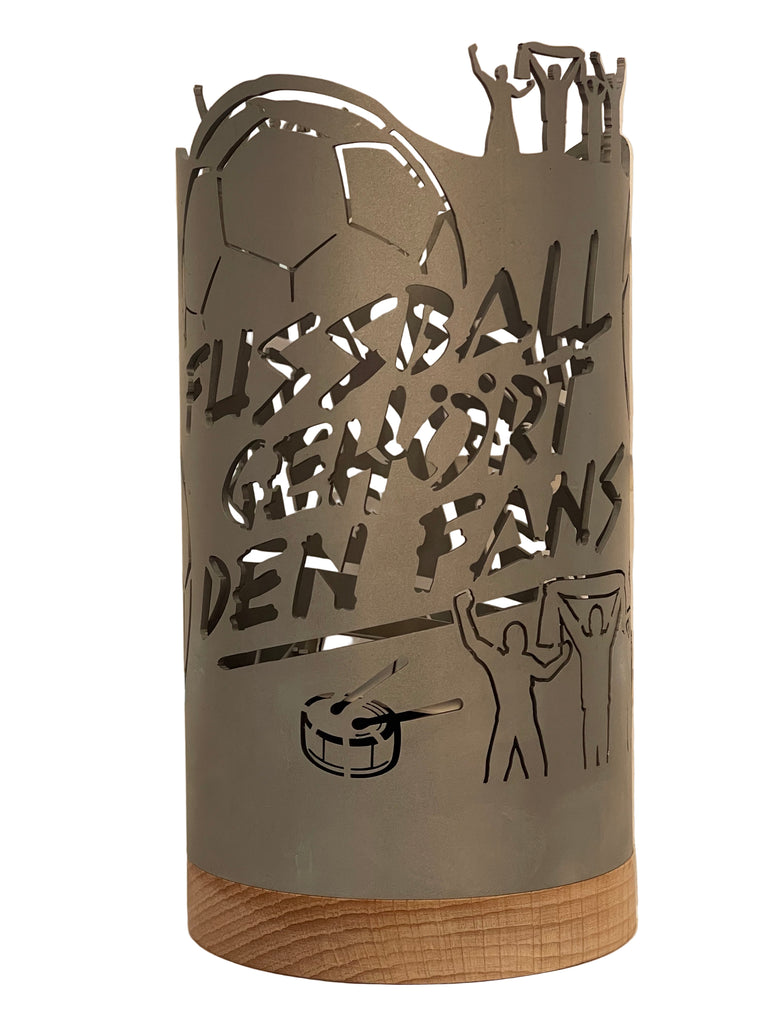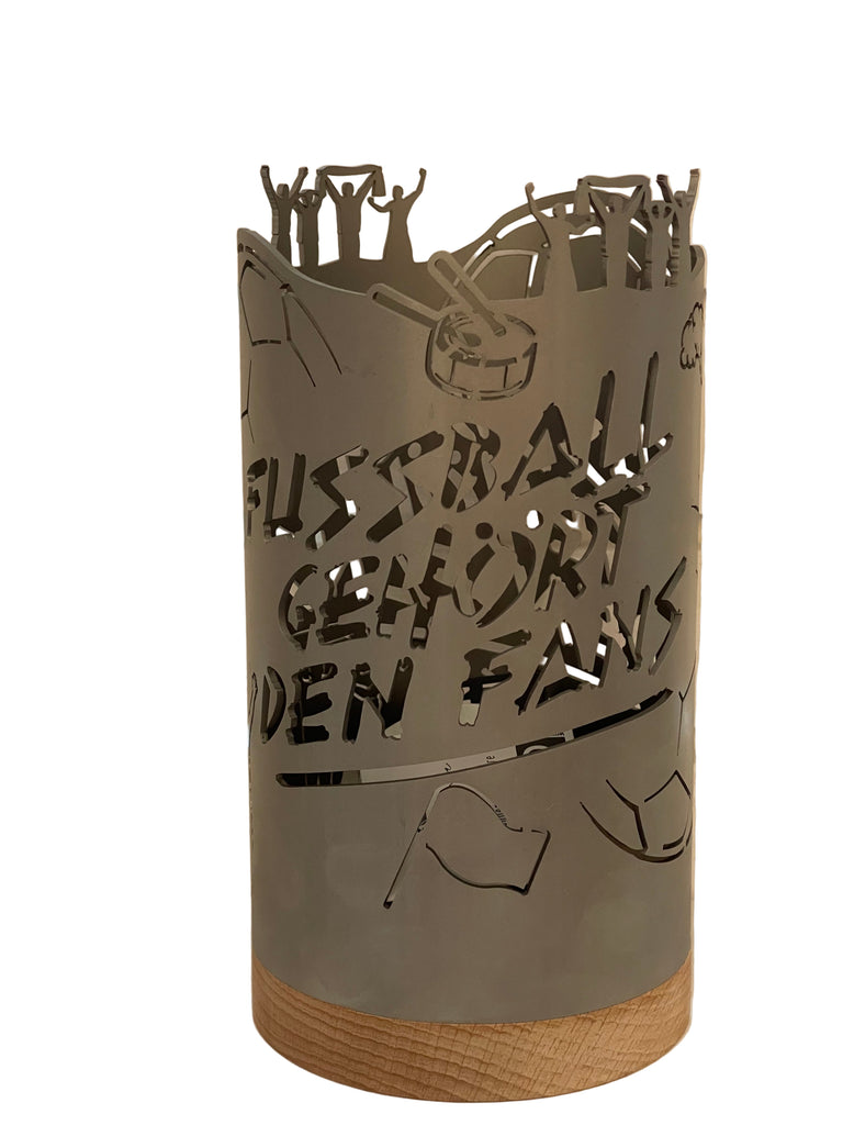 aus Edelstahl aus einem Standfuß aus Holz mit Logo und Schriftzug passend für ein Teelicht oder 3 Räucherkerzchengrößen