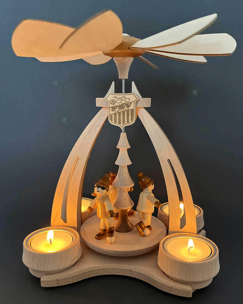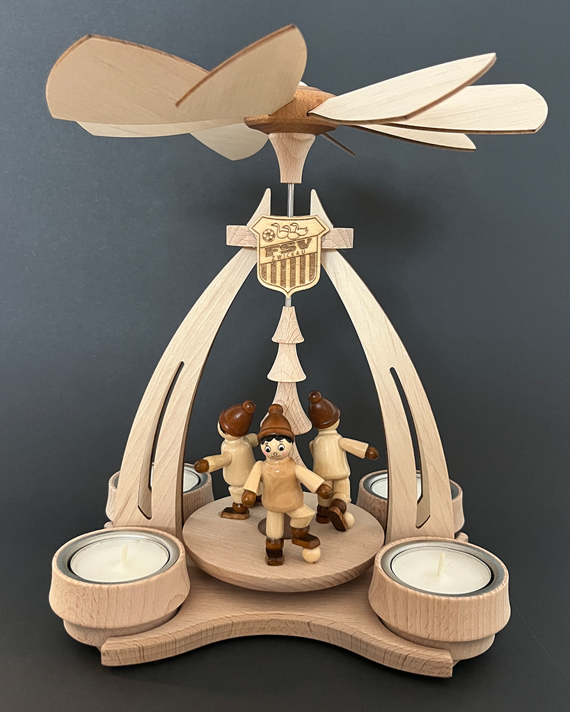 Teelicht-Tischpyramide mit Fußballfiguren und dezentem FSV-Logo für 4 Teelichte. | Made in Germany.
